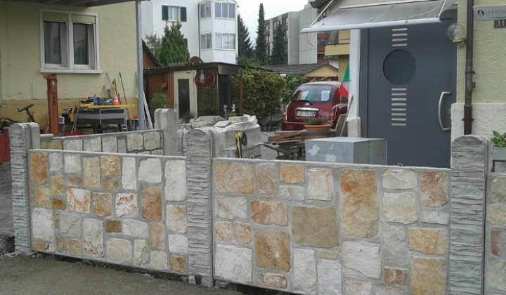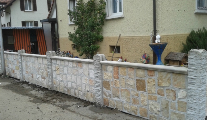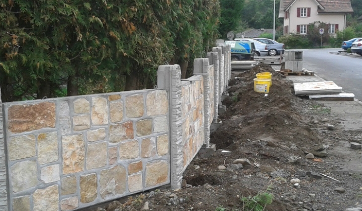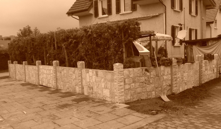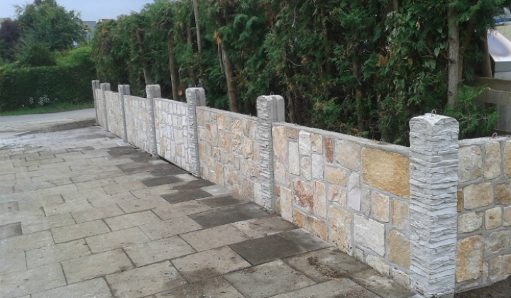 recinzione realizzata con tranciato misto (trani), pannelli bifacciali altezza finita 100 cm con coprimuro in cemento.
