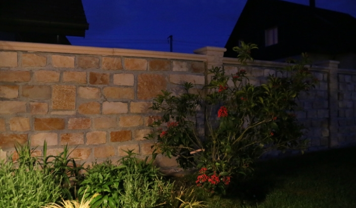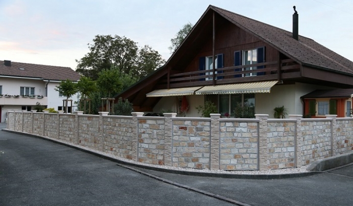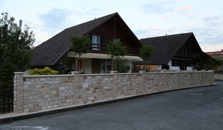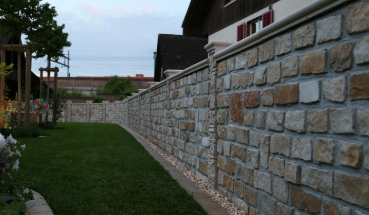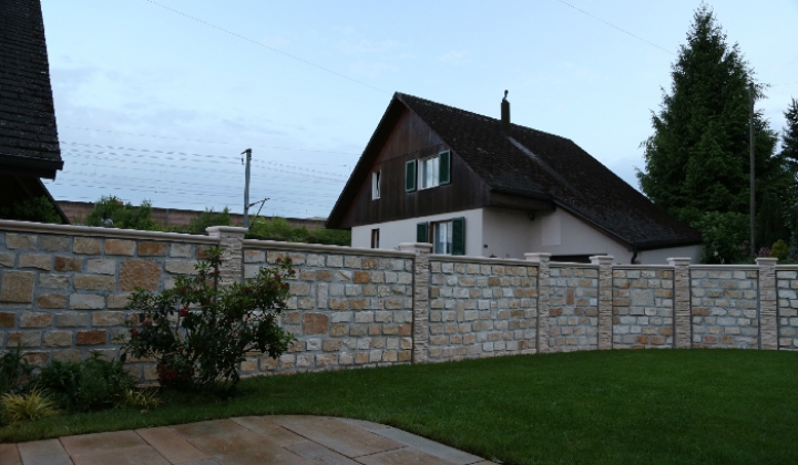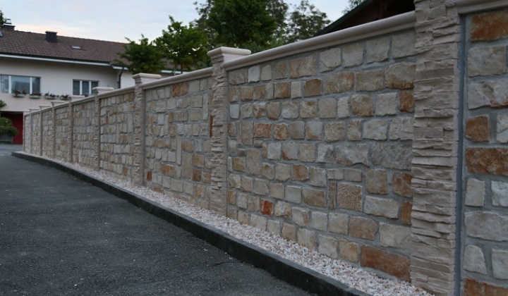 recinzione realizzata con PIETRA BIFACCIALE altezza 120cm. fugature grigio, con pilastri e coprimuro di tipo avorio.