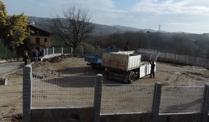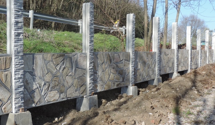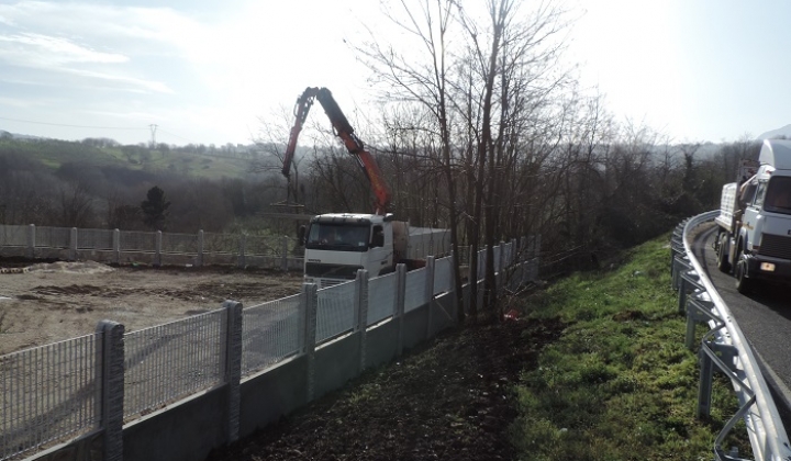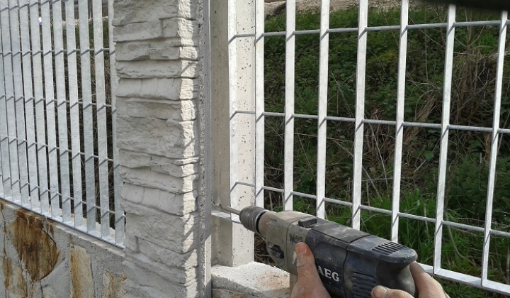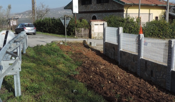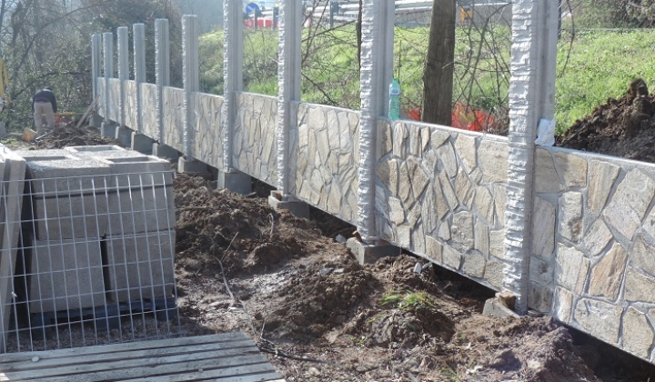 Recinzione realizzata con pietra di trani a mosaico, con sovrapposizione di pannelli in grigliato tipo (orsogril)