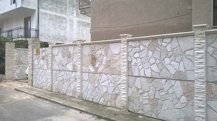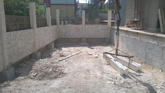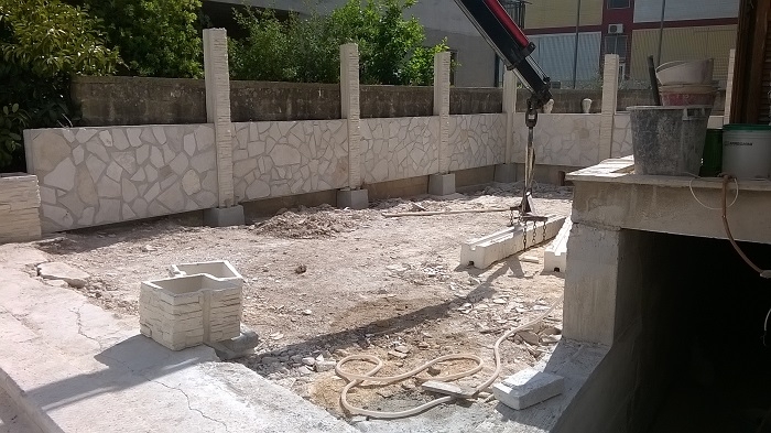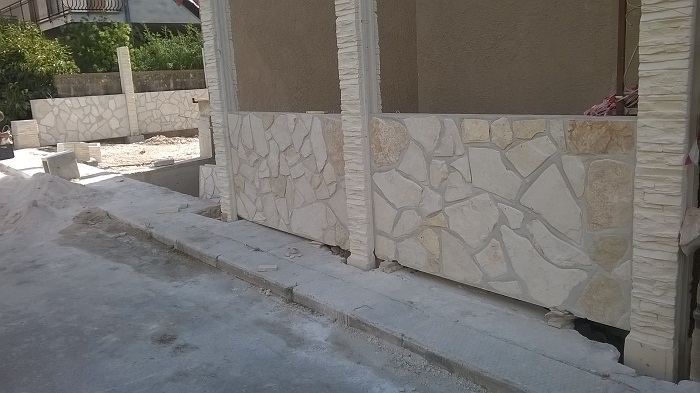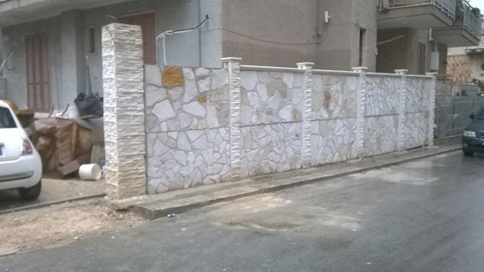 Realizzazione di pannelli con pietra di trani a mosaico (anticato) con pilastri beige.