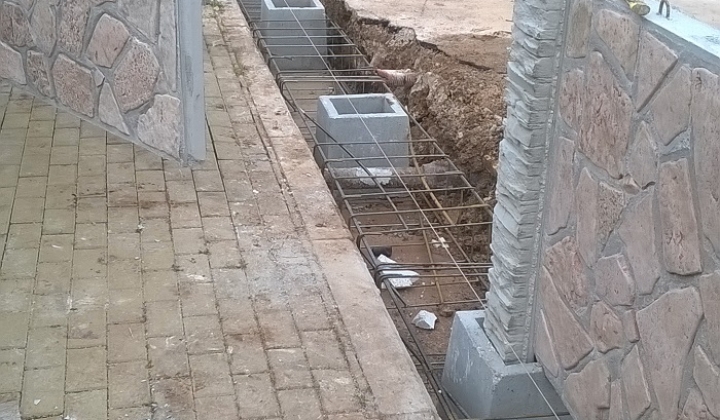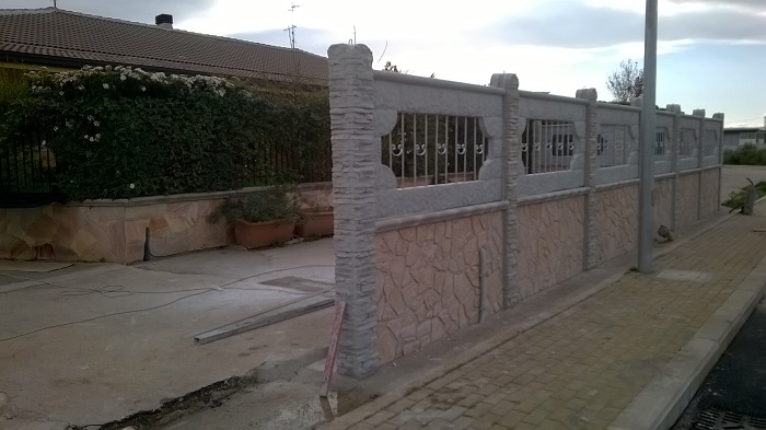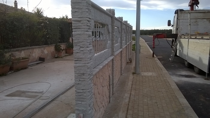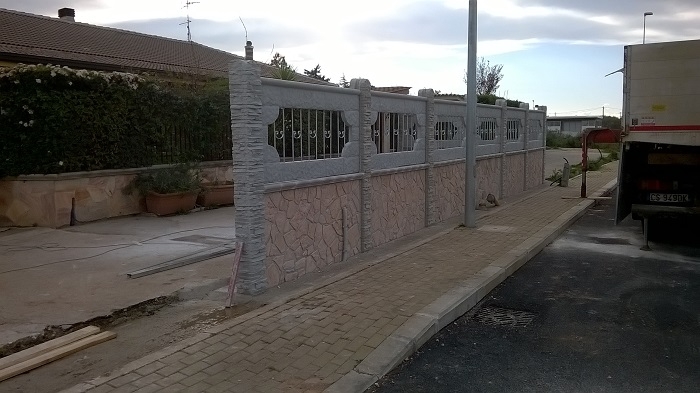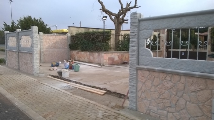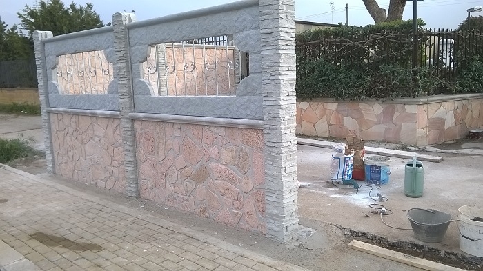 Recinzione realizzata con pannelli in pietra rosa anticata, con sovrapposizione di pannelli con archetti zincati.