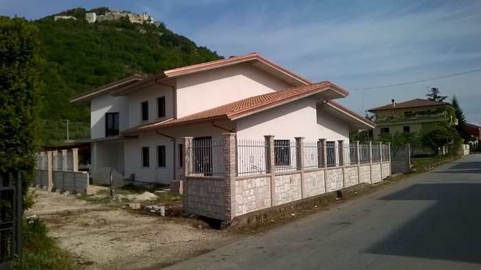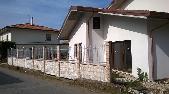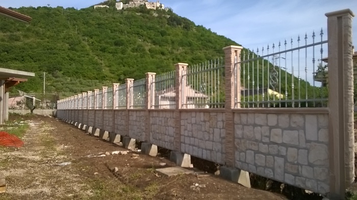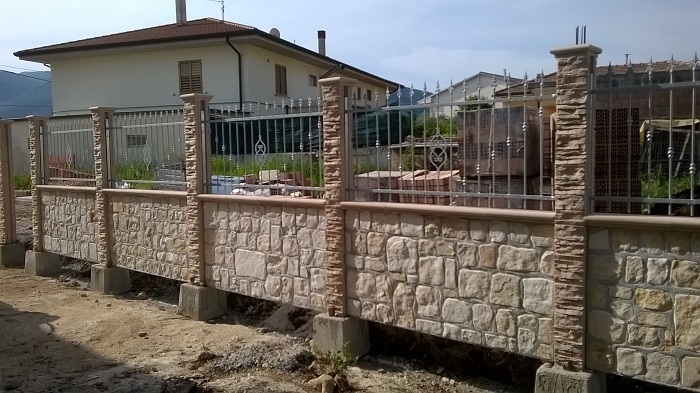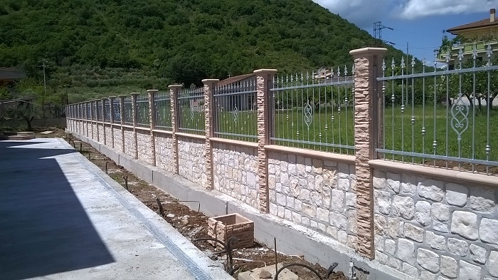 Recinzione realizzata con pietra di tipo tranciato anticato, con pilastri colorati, e ringhiera zincata.